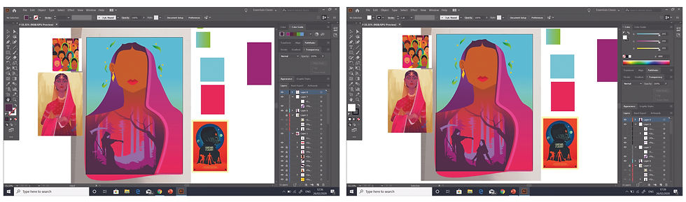 I started with the base image where I had the silhouette of the face and started to fill her with colour. I added gradients to some of the image such as her body, lips and headscarf to add more depth and variation. I then started to add part of the forest on her body. I used the pen tool to create the shape and then filled the shape with a gradient colour. I use the same colour as in her hair but made it go from a solid colour to transparent so it all blends together nicely.