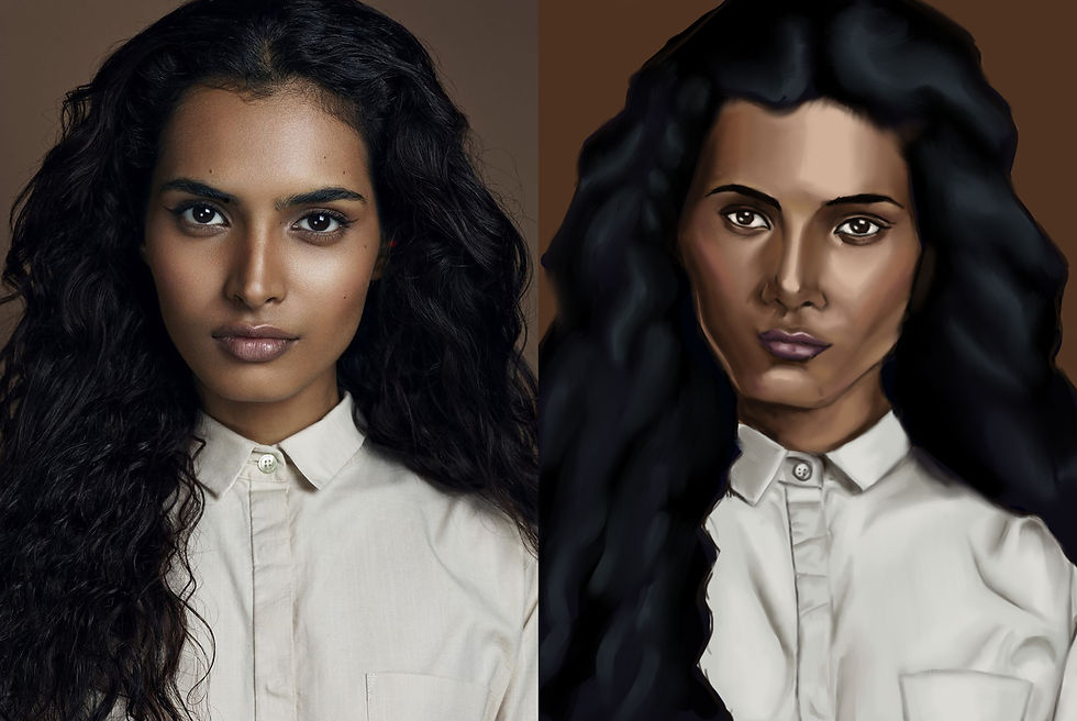 Day 4 & 5: These days I spent more time on the finer details of the portrait, I spent more time blending the portrait to make the skin look a bit more realistic. I also added small details like pores and freckles on the skin. I also added finer strands in the hair to make it look more real. To add my own style to this I used a few different texture brushes and layered them above the portrait and tried a bit of colour dodge to make colourful highlights.
